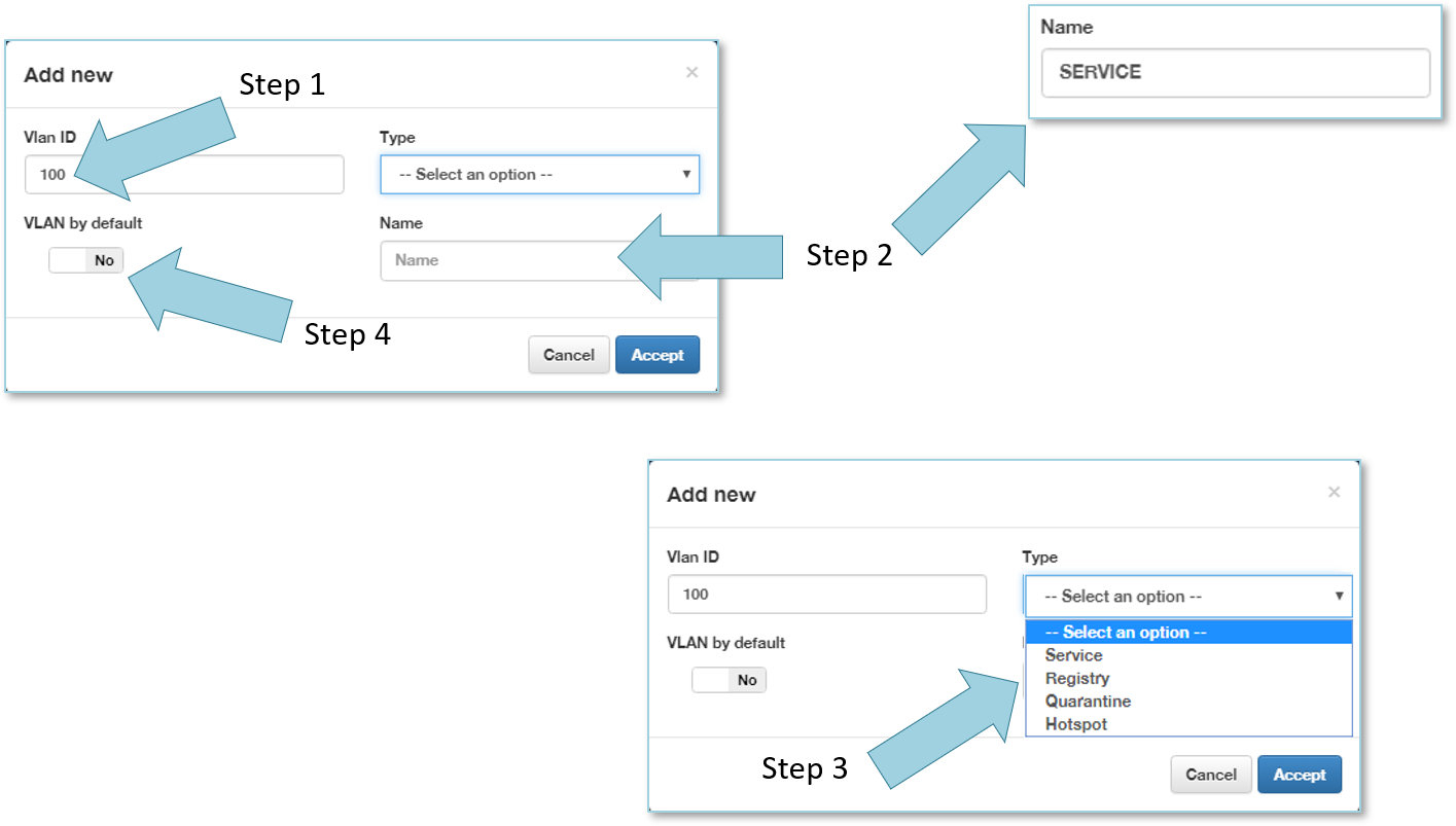 Assign a VLAN name, in this case SERVICE name is used as shown by the step 2