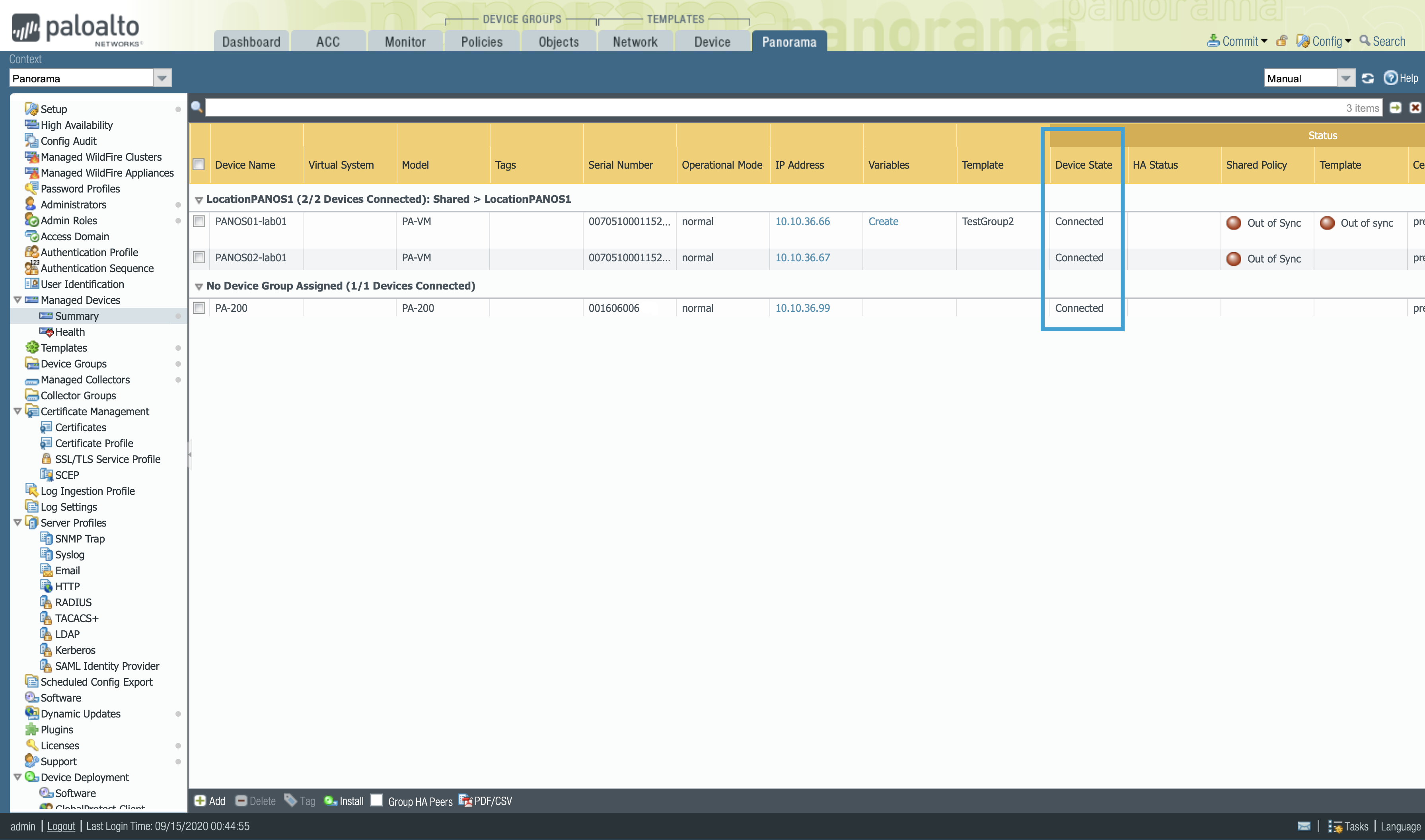 - Panorama web interface -> Panorama > Managed Devices > Summary