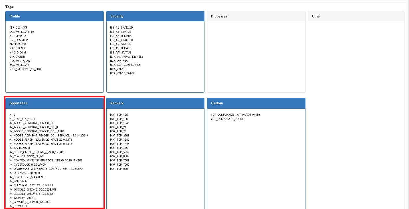 GREEN: Application Tags, the software inventory collected by openNAC agent should be explicit here, with every software version.