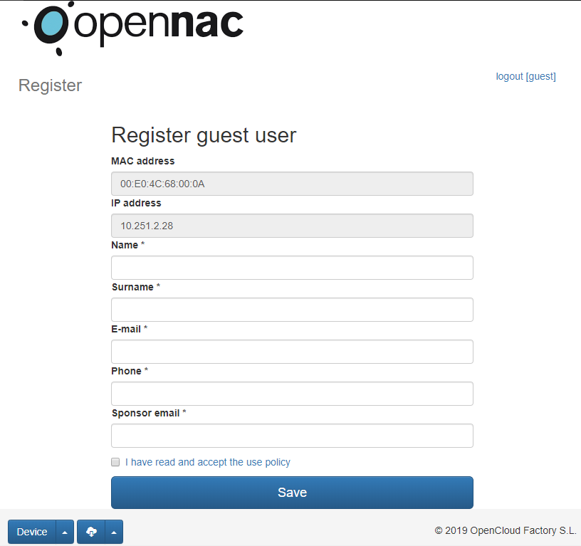 - The guest must complete a registration formulary, then openNAC sends a mail to a sponsor.