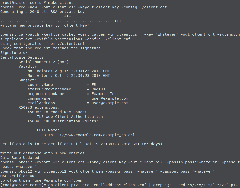 A copy of the PEM file is generated with the emailAddress name, but is highly recommended copy the P12 file to preserve it with the same format, due to Windows clients can import this file using the system wizard.
