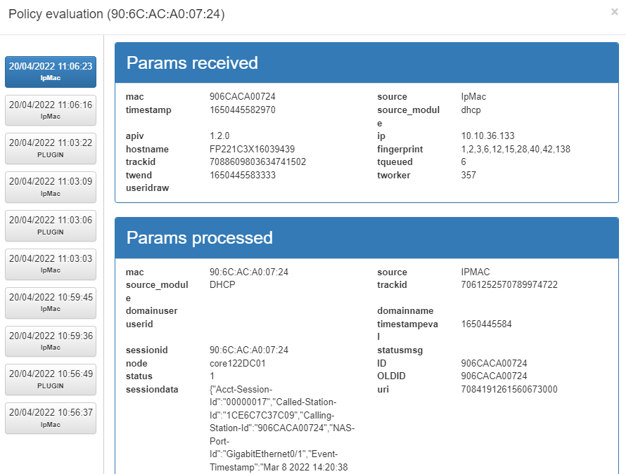View the IPs: ipMac with source dhcp. Go to the policy evaluation on the OpenNAC Enterprise Web Administration Portal go to ON NAC -> Business Profile, select the Business Profile with the issue, click on the eye icon of the event and select IpMac until you see “dhcp” as source module
