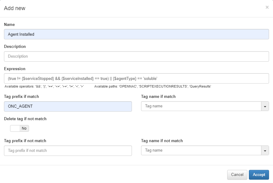 If the expression matches, the tag that will be added is specified in the column Tag name if match. If the tag doesn’t match the tag that will be added is specified in the column Tag name if not match.