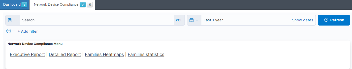 Network Device Compliance Menu: Shows the different windows of the dashboard and allows to switch between them. The dashboard windows are Executive Report, Detailed Report, Families Heatmaps and Families statistics.