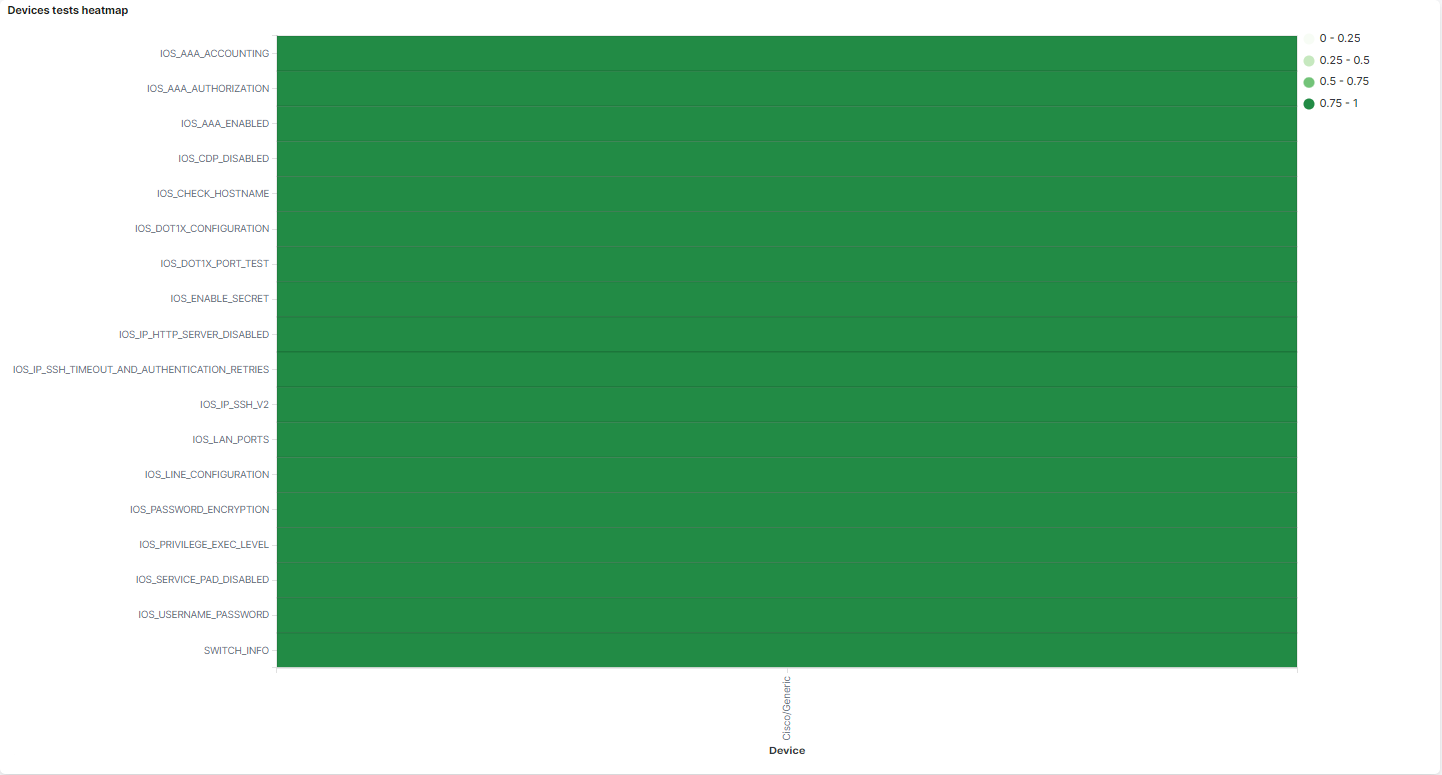 Devices groups heatmap: Shows a heatmap with the groups and the network devices brands and models that are passing these groups.