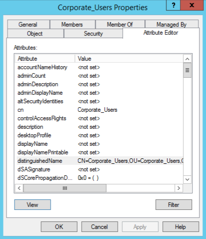 The attribute editor window will be displayed. Edit the attribute distinguedName and copy and save the this attribute to be used to define an LDAP filter.