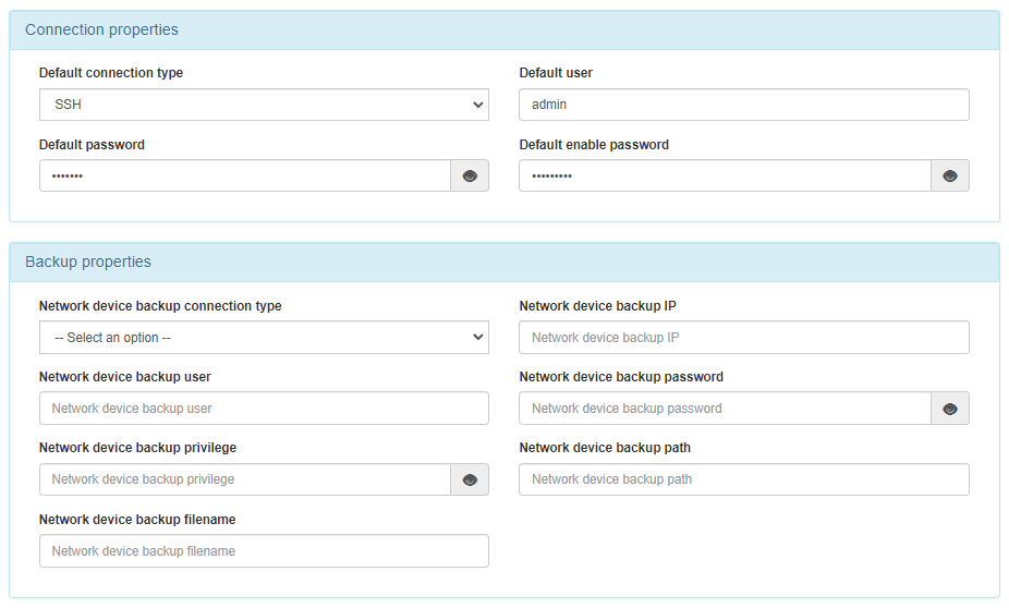 Access the “Configuration -> Configuration Vars -> NetDev” and configure the global parameters for connection and backup.