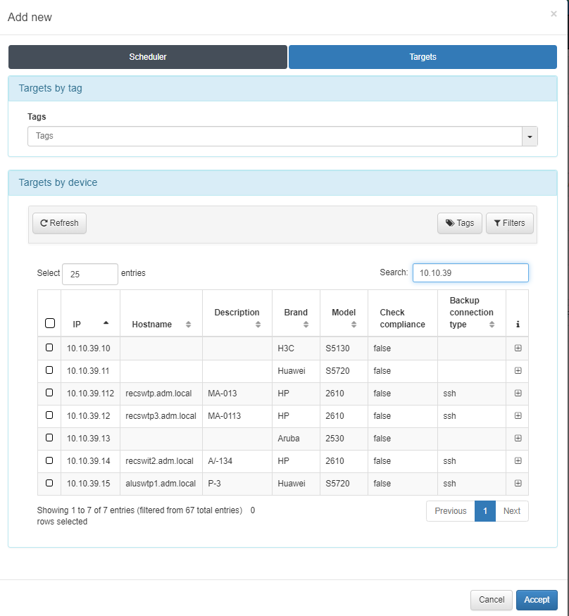 In this tab, all network devices that have been previously configured in “On CMDB -> Network Devices”, will appear as targets.