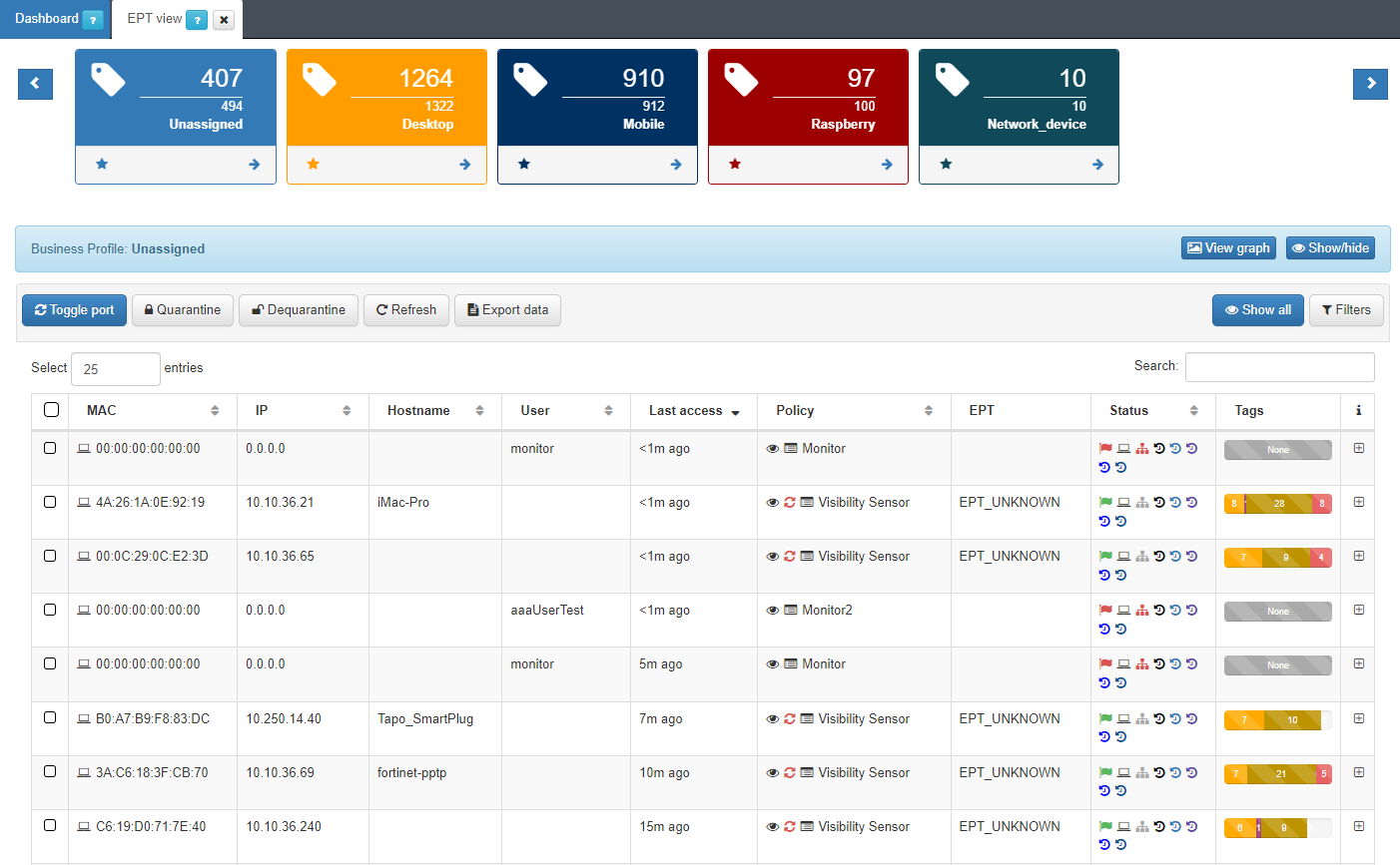 In the Business Profiles section, we can also see another profile that shows us a group of devices classified by the EPT label, End Point Type. By default, we have the “EPT View” profile.