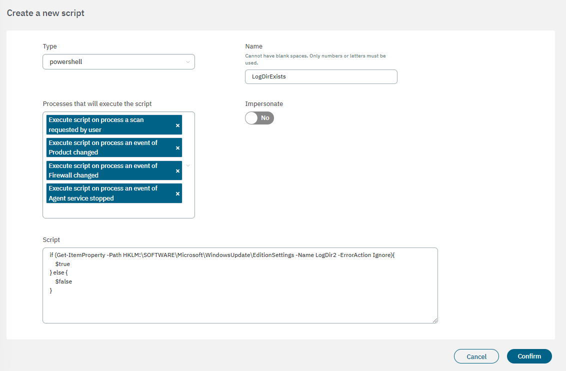 Impersonate: You can choose whether the script will be executed by the system or only when the user is logged in when using the PowerShell script type. For the Bash type, this option is disabled.