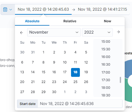 In the first section (Quick select), we can quickly select a time period from the current moment to where it is configured. For example, the last 15 minutes, hours, days, etc.